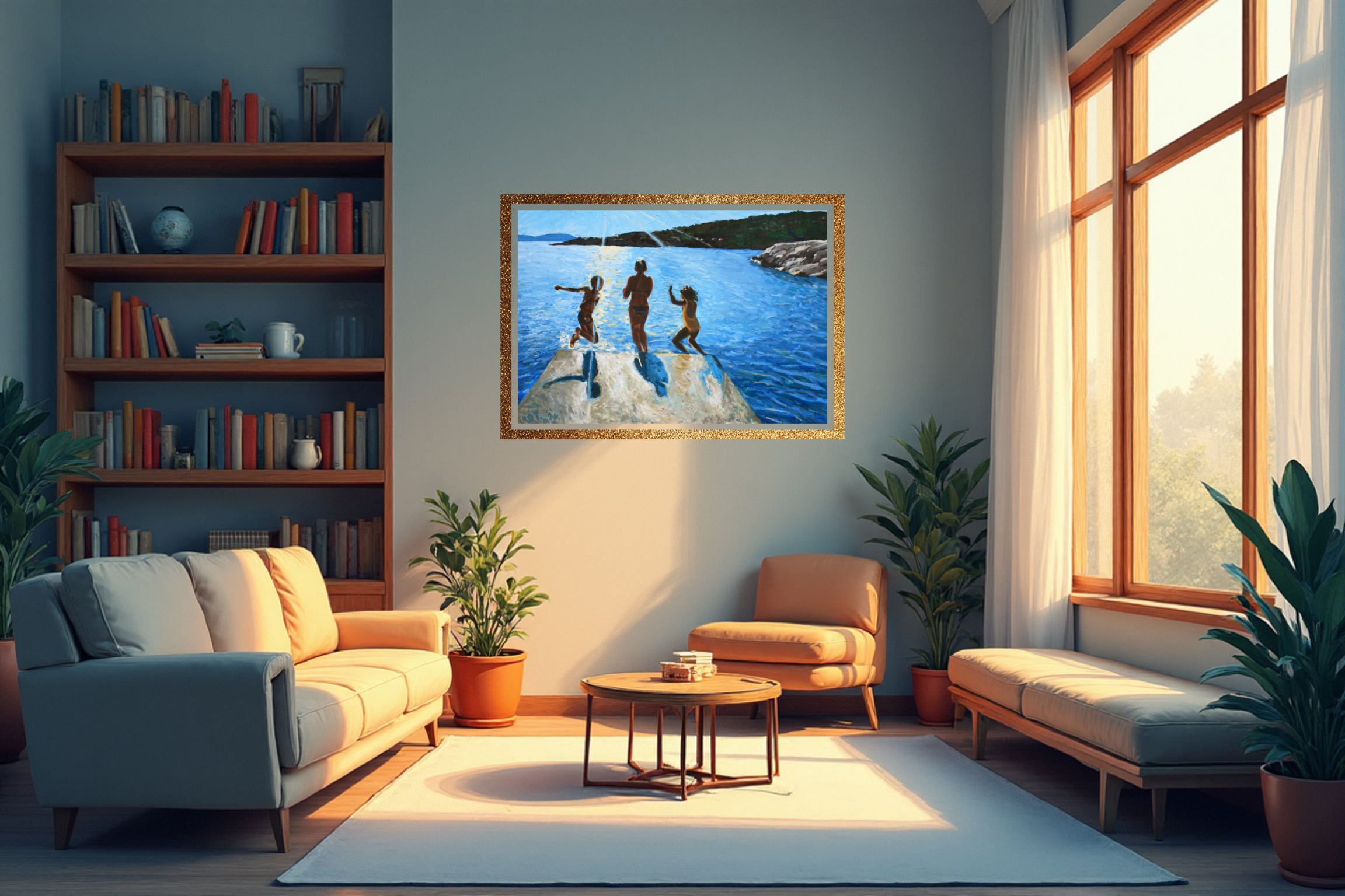 Each print tells a gentle story — a jump into the sea, a game under the olive tree, the silence of nature embracing us.